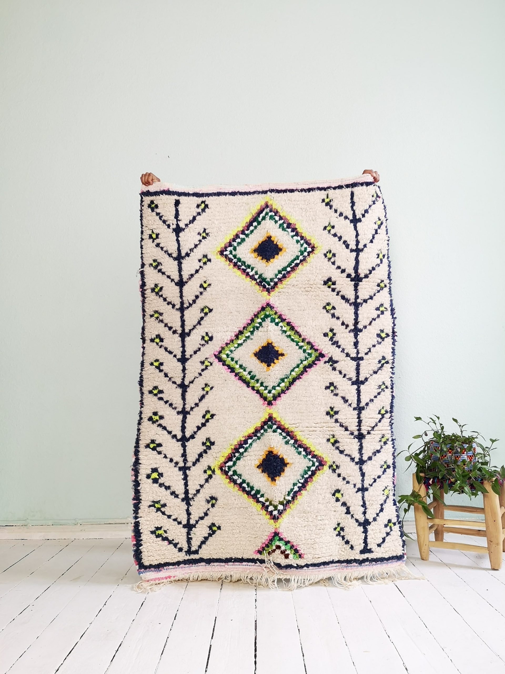 Bei diesem Teppich handelt es sich um eine neue zeitgenössische Interpretation der Berber Teppiche der Region Azilal.