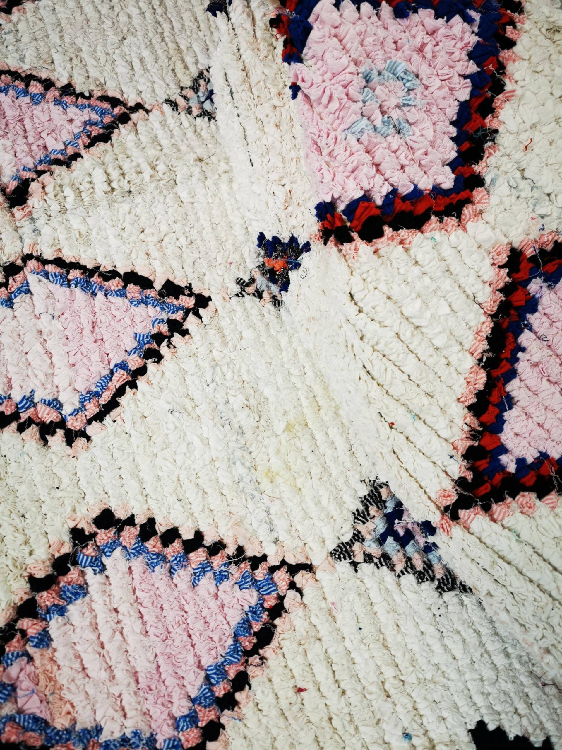 Nachhaltiger Berber Teppich Hiba mit sanften Rosa-Rauten und Blumensäumen in Rosa/Schwarz/Pink auf Weiß. 235×138 cm, vegan aus recycelten Materialien, handgefertigt in einer sozialen Fraueninitiative. Schafft eine ruhige, feminine Wohlfühlatmosphäre.