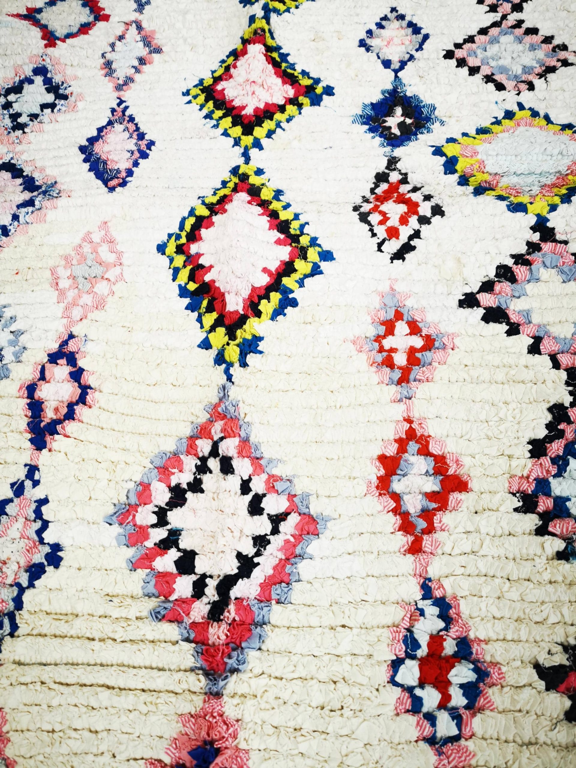 Der nachhaltige Berber Teppich „Basma“ (211×114 cm) vereint lebhafte, gelbe Rauten auf weißem Grund mit robuster, veganer Qualität. Handgefertigt aus recycelten Materialien in einer sozialen Fraueninitiative – für farbenfrohes, verantwortungsvolles Wohnen.