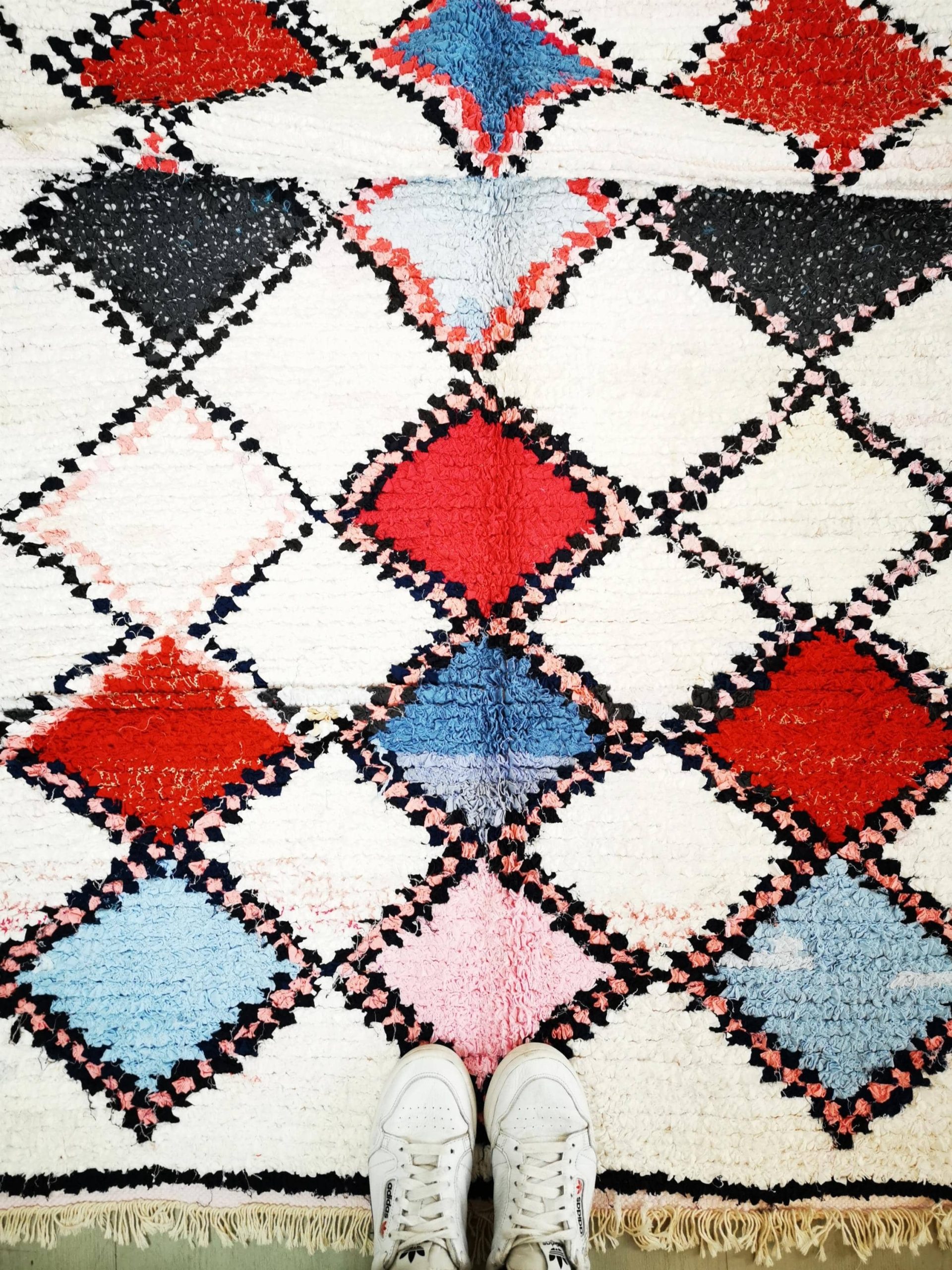 eganer Berberteppich Naima mit mittelgroßen blauen & roten Rauten auf weißem Grund. 200×135 cm, tierfrei aus recycelten Materialien, handgefertigt in einer Fraueninitiative. Kontrastreicher, moderner Blickfang für große Räume.