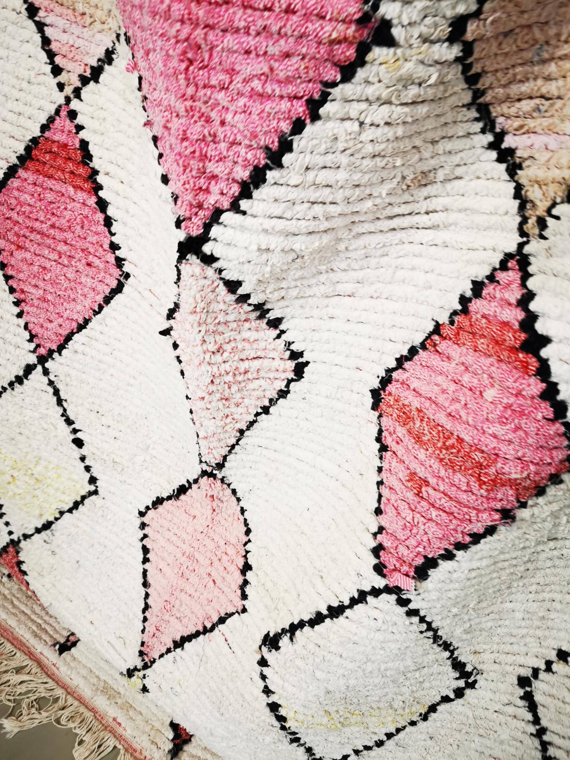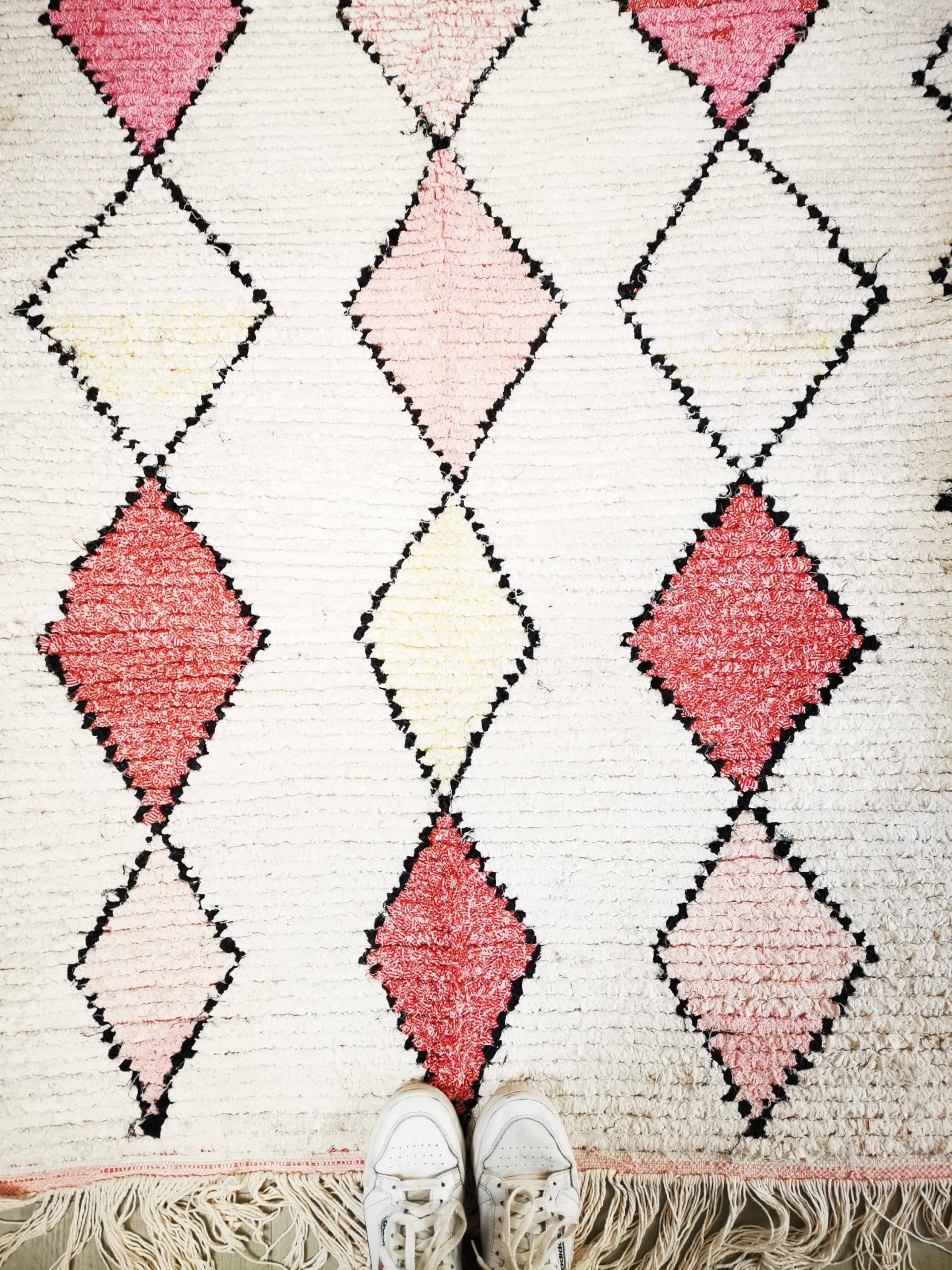 Entdecken Sie den veganen Berberteppich „Safia“: Ein sanftes Unikat in Weiß mit pastelgelben Akzenten und verspielten Rauten in verschiedenen Pink- und Rosatönen. Handgeknüpft in Marokko aus 100% recycelten Materialien, verbindet er nachhaltiges Design mit weicher, hochfloriger Haptik. Perfekt für ein modernes, helles Wohnambiente.