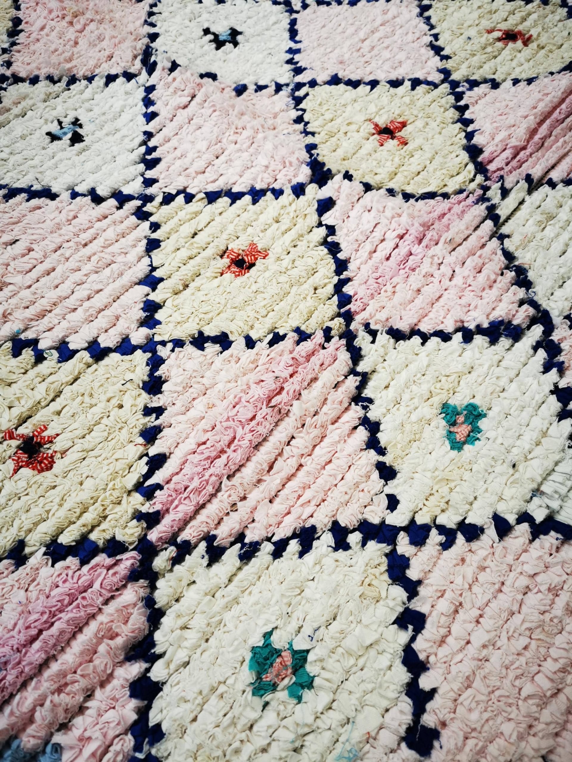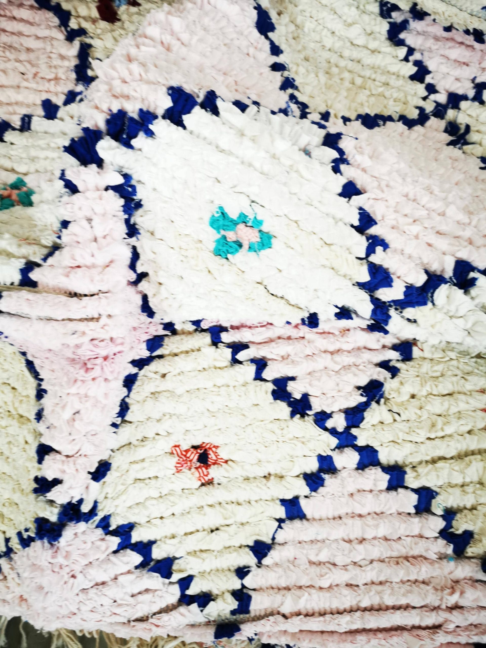 Handgefertigter waschbarer Berber Teppich Mina mit dunkelblauen Rauten & bunten Kreuzen am Rand. Grundfarbe Hauch Rose, Eierschale & Weiß. 193×138 cm, vegan & recycelt, pflegeleicht.