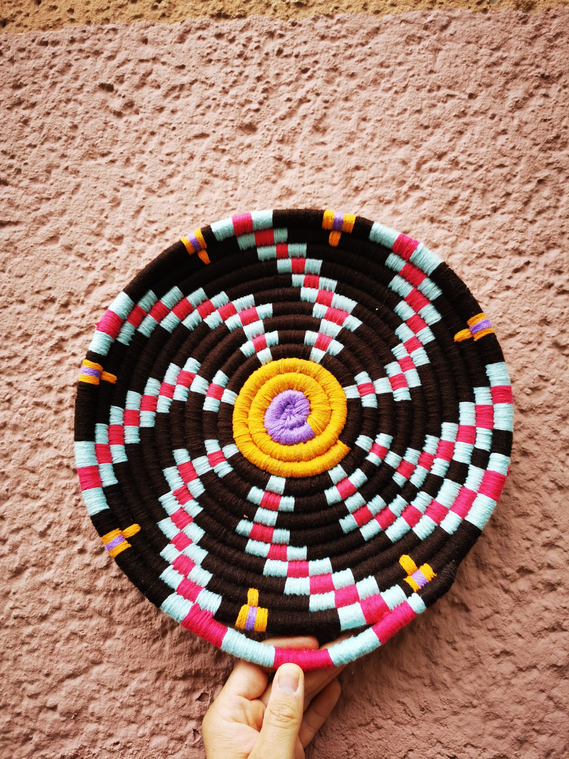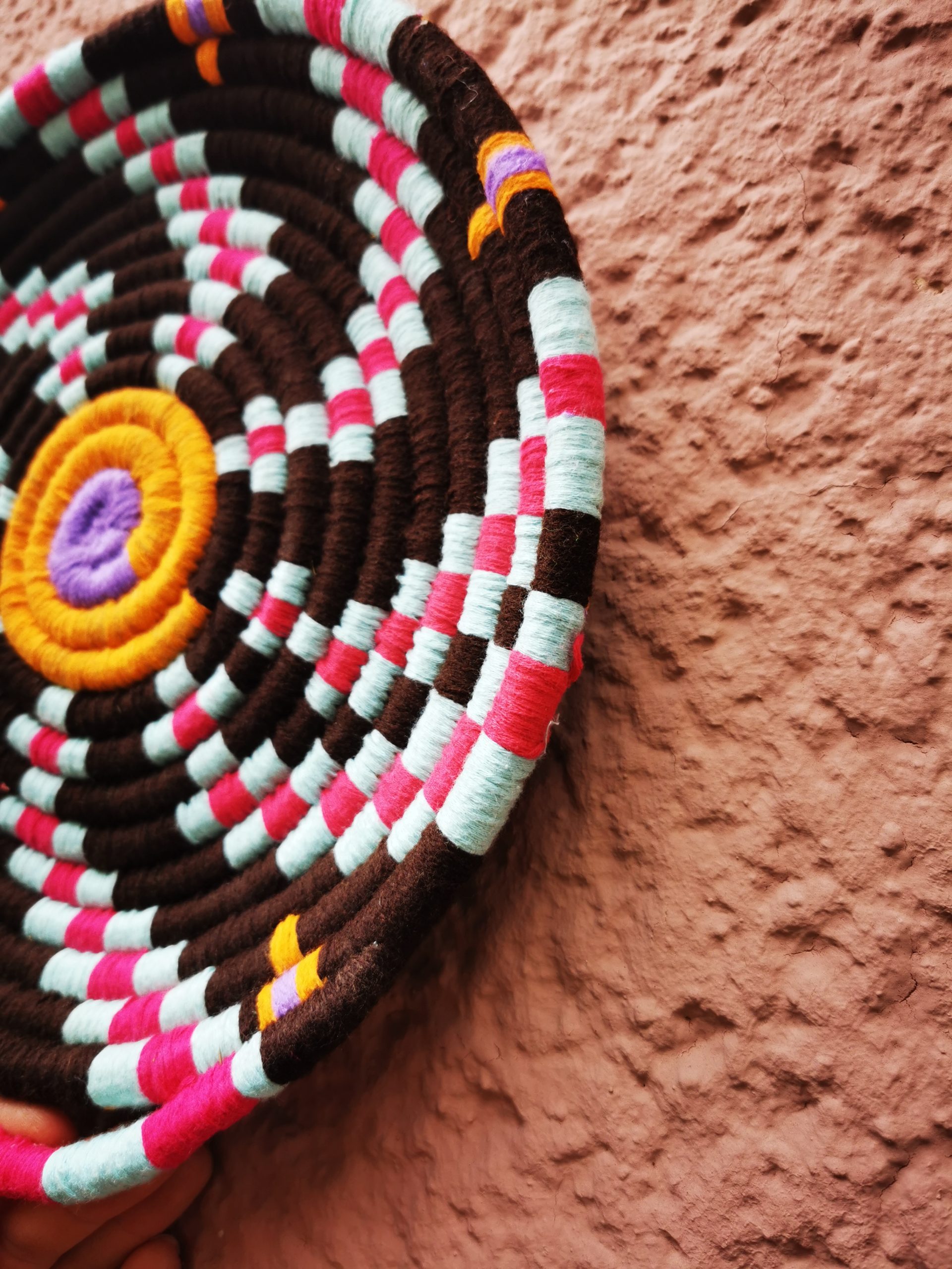 Entdecke die Magie der Berberkunst: Handgefertigte Teller aus Pflanzen und recyceltem Garn.